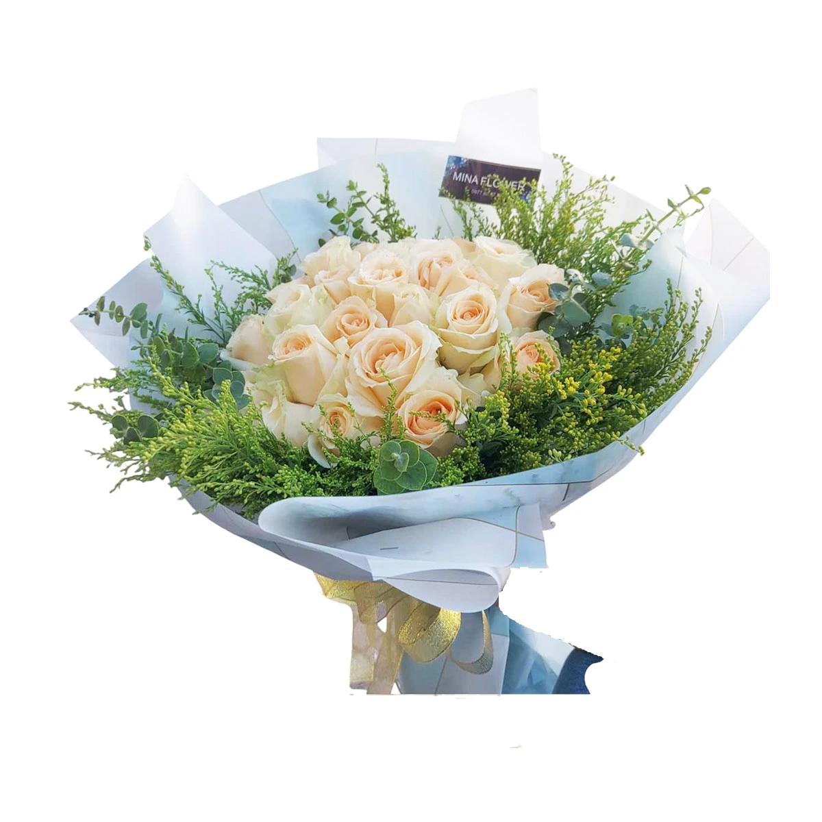 Bó hoa hồng vàng kem sang trọng tại Hoa Mina là sự kết hợp tinh tế giữa sắc vàng kem dịu dàng cùng với hoa lá phụ xanh mướt, tạo nên một tổng thể hài hòa, thanh lịch và cuốn hút. Tông kem nhẹ nhàng nhưng không kém phần trang trọng, gợi cảm giác tinh khôi và cao quý, phù hợp để gửi gắm thông điệp yêu thương, tri ân hay chúc mừng trong bất kỳ hoàn cảnh nào.