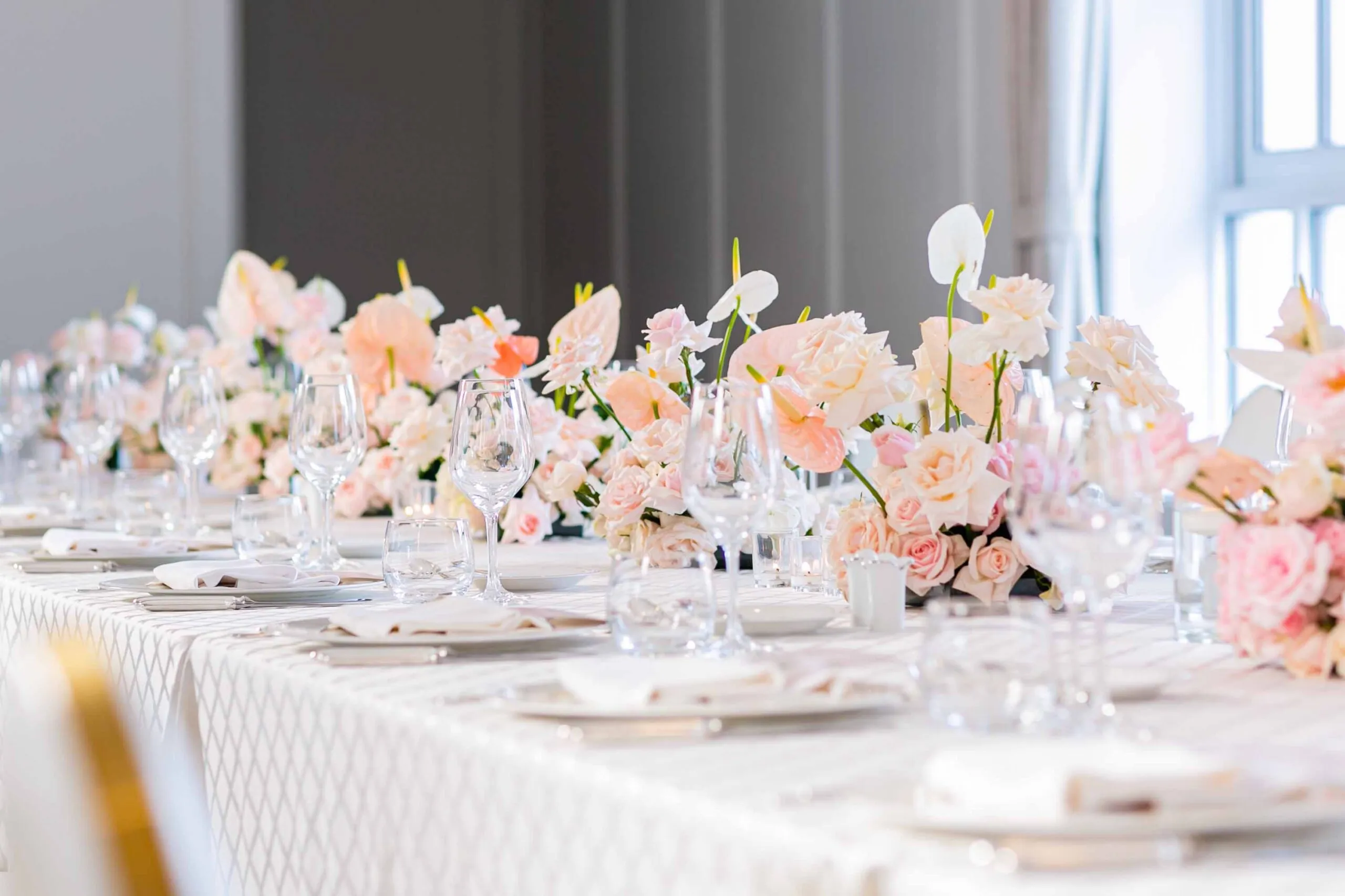 Đây là lựa chọn phổ biến cho các lễ kỷ niệm quy mô lớn hoặc sự kiện quan trọng như 10 năm, 20 năm thành lập. Không gian thường sử dụng tông màu trắng, vàng hoặc ánh kim, kết hợp cùng hoa tươi cao cấp như lan hồ điệp, hoa hồng.