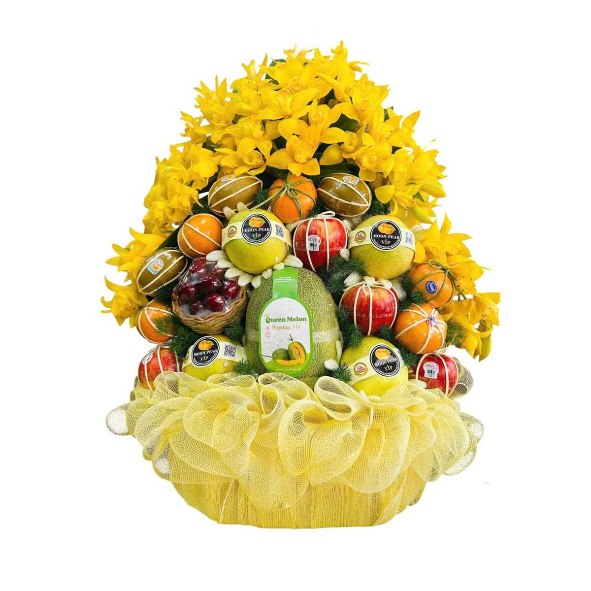 Giỏ hoa quả lễ cao cấp là sự lựa chọn hoàn hảo dành cho những ai mong muốn chuẩn bị một lễ vật chu toàn, sang trọng và đầy ý nghĩa. Với sự kết hợp hài hòa của các loại trái cây nhập khẩu tươi ngon như táo đỏ, cam Mỹ, lê Hàn Quốc, bưởi da xanh, dưa lưới Nhật cùng sắc vàng rực rỡ của hoa lan, sản phẩm toát lên vẻ đẹp tinh tế, trọn vẹn cả hình thức lẫn giá trị tinh thần.