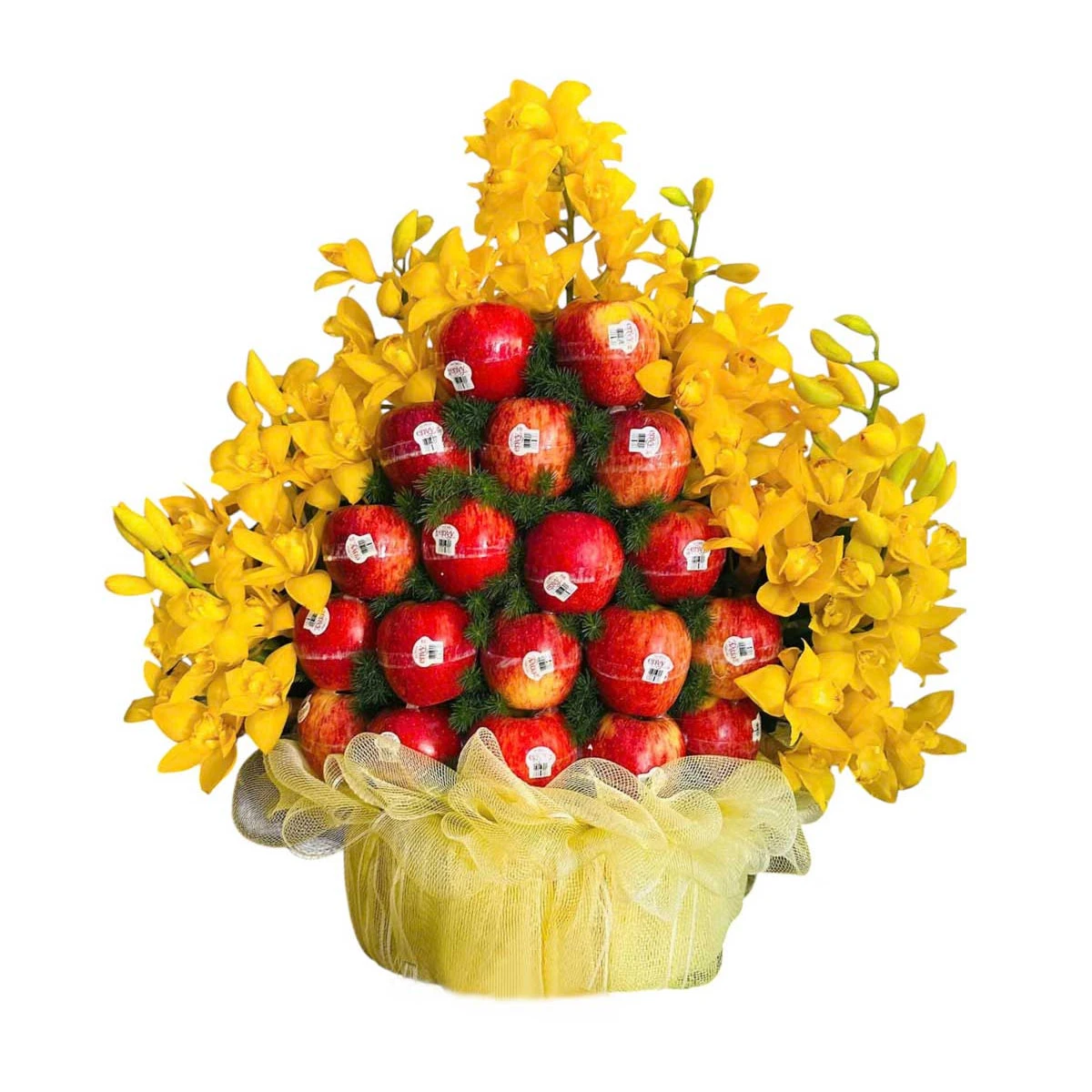 Mâm hoa quả lễ táo đỏ lan vàng là lựa chọn hoàn hảo cho những dịp lễ nghi quan trọng. Với sắc đỏ căng mọng của táo nhập khẩu và màu vàng rực rỡ của hoa địa lan, sản phẩm không chỉ mang vẻ đẹp sang trọng, tươi sáng mà còn chứa đựng nhiều ý nghĩa phong thủy tốt lành.